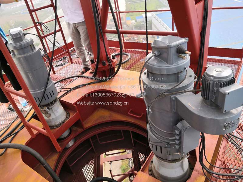 The slewing mechanism adopts frequency conversion speed regulation, adopts torque motor soft start, eddy current brake fast stop, Yaskawa frequency conversion anti-sway technology, and a variety of special slewing technologies to ensure the stability of rotation. The rotating motor is equipped with a wind vane to ensure the safety of the tower crane rotation in high wind conditions.